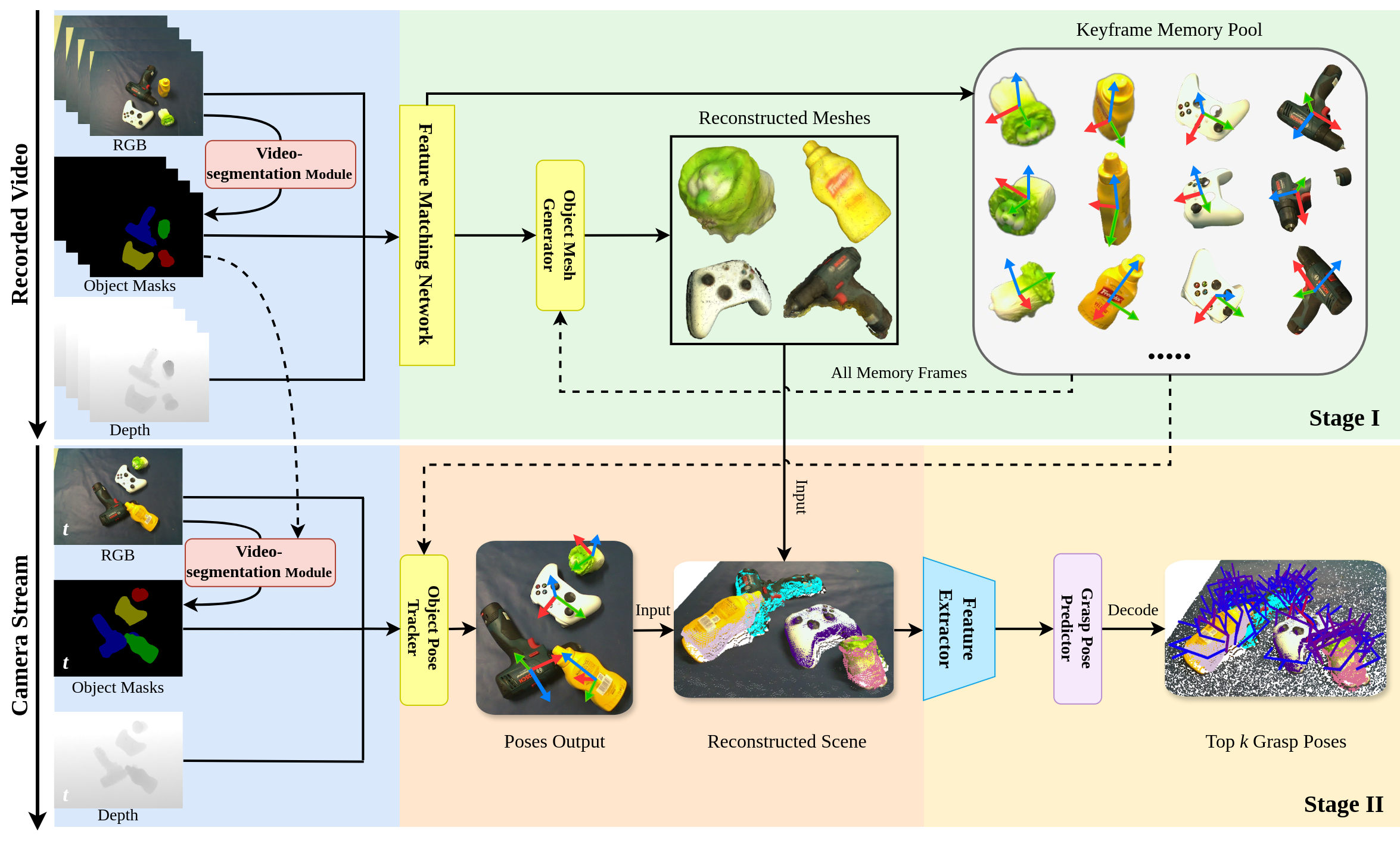 In the realm of robotic grasping, achieving accurate and reliable interactions with the environment is a pivotal challenge. Traditional methods of grasp planning methods utilizing partial point clouds derived from depth image often suffer from reduced scene understanding due to occlusion, ultimately impeding their grasping accuracy. Furthermore, scene reconstruction methods have primarily relied upon static techniques, which are susceptible to environment change during manipulation process limits their efficacy in real-time grasping tasks. To address these limitations, this paper introduces a novel two-stage pipeline for dynamic scene reconstruction. In the first stage, our approach takes scene scanning as input to register each target object with mesh reconstruction and novel object pose tracking. In the second stage, pose tracking is still performed to provide object poses in real-time, enabling our approach to transform the reconstructed object point clouds back into the scene. Unlike conventional methodologies, which rely on static scene snapshots, our method continuously captures the evolving scene geometry, resulting in a comprehensive and up-to-date point cloud representation. By circumventing the constraints posed by occlusion, our method enhances the overall grasp planning process and empowers state-of-the-art 6-DoF robotic grasping algorithms to exhibit markedly improved accuracy.